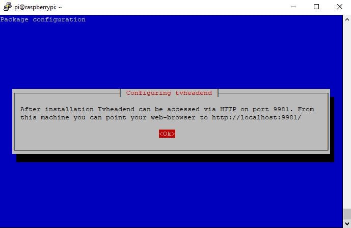 Open up a web browser and enter the IP address of your Raspberry Pi. Also, use the port number ‘9981’. For example http://192.168.1.168:9981 (Your IP address for the RPi will be different.) Type ifconfig in the terminal screen to confirm.